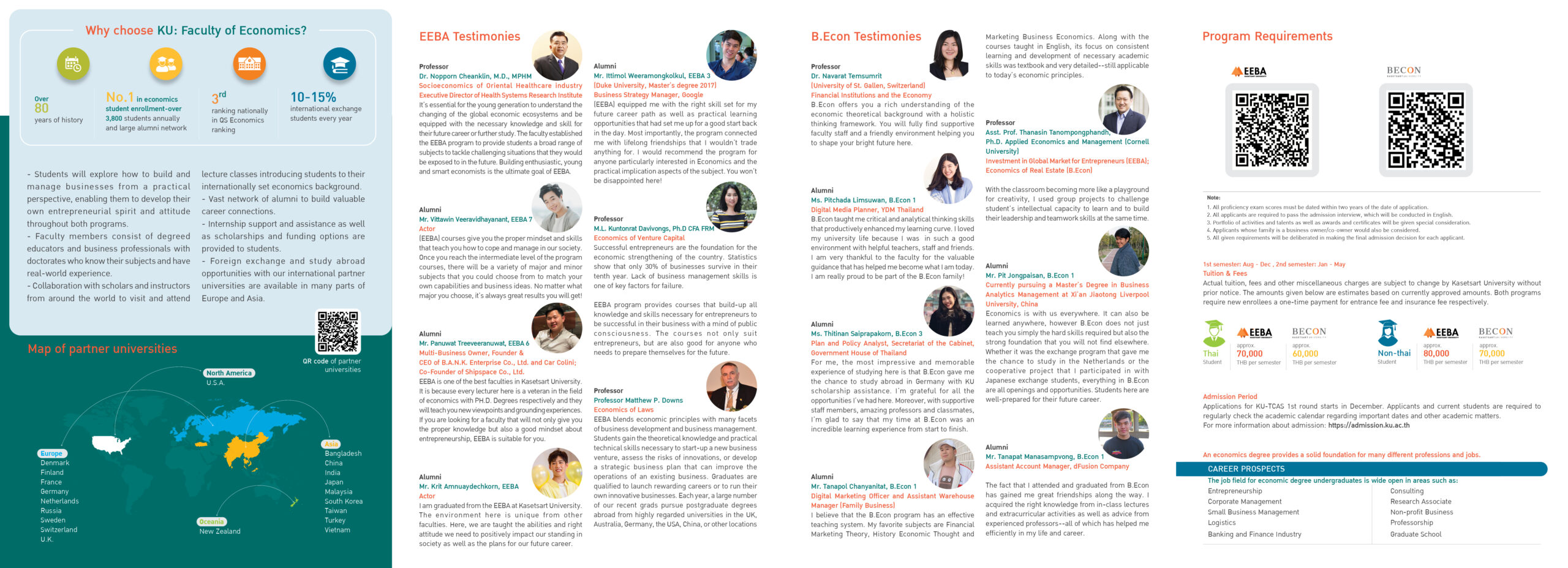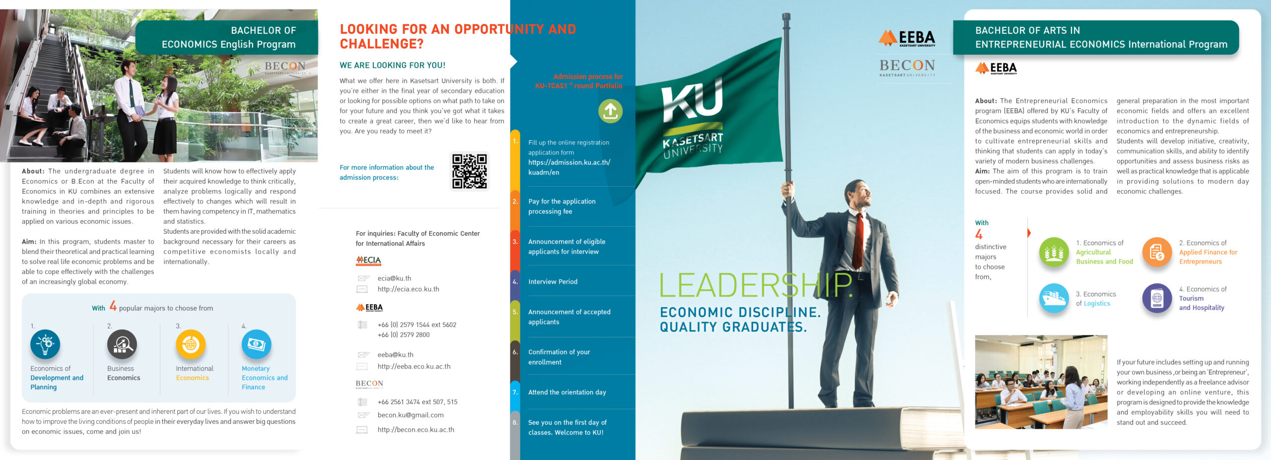 Find out more about the international programs available at the Faculty of Economics, Kasetsart University, including the EEBA International Program (B.A. in Entrepreneurial Economics) through our official brochure.