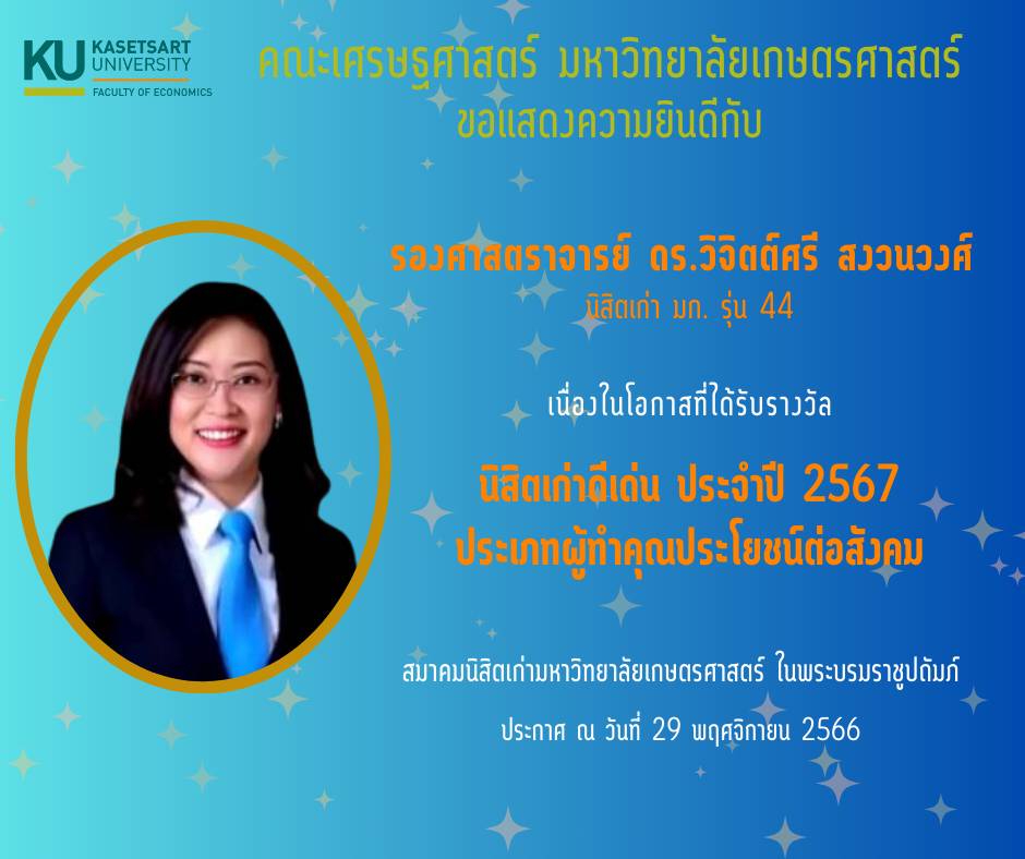 รองศาสตราจารย์ ดร.วิจิตต์ศรี สงวนวงศ์นิสิตเก่า มก. รุ่น 44เนื่องในโอกาสที่ได้รับรางวัลนิสิตเก่าดีเด่น ประจำปี 2567ประเภทผู้ทำคุณประโยชน์ต่อสังคูม