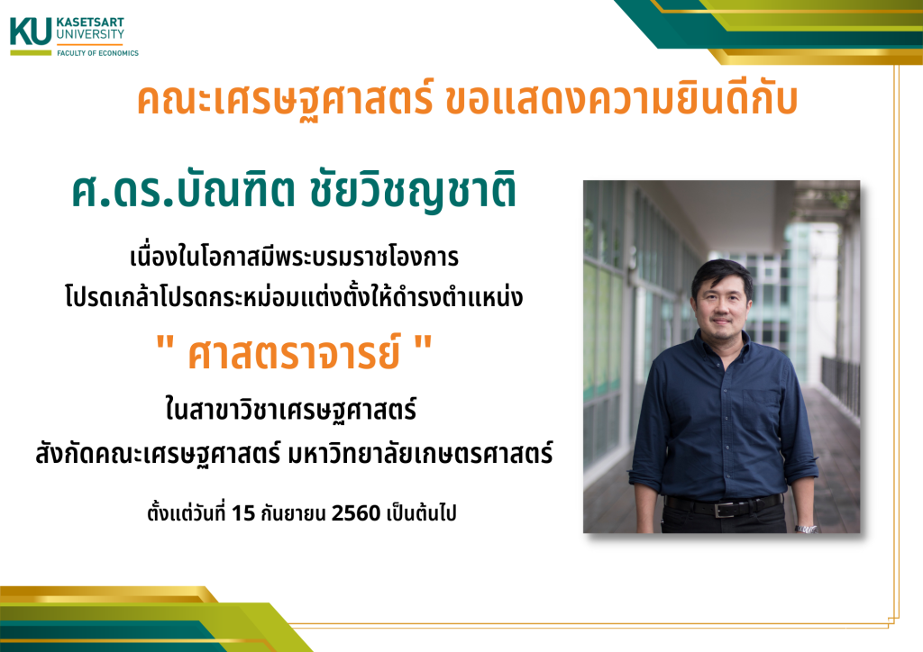 ผศ.ดร.วิศิษฐ์ ลิ้มสมบุญชัยเนื่องในโอกาสได้รับอนุมัติแต่งตั้งจากสภามหาวิทยาลัยเกษตรศาสตร์ให้ดำรงตำแหน่ง”คณบดีคณะเศรษฐศาสตร์”