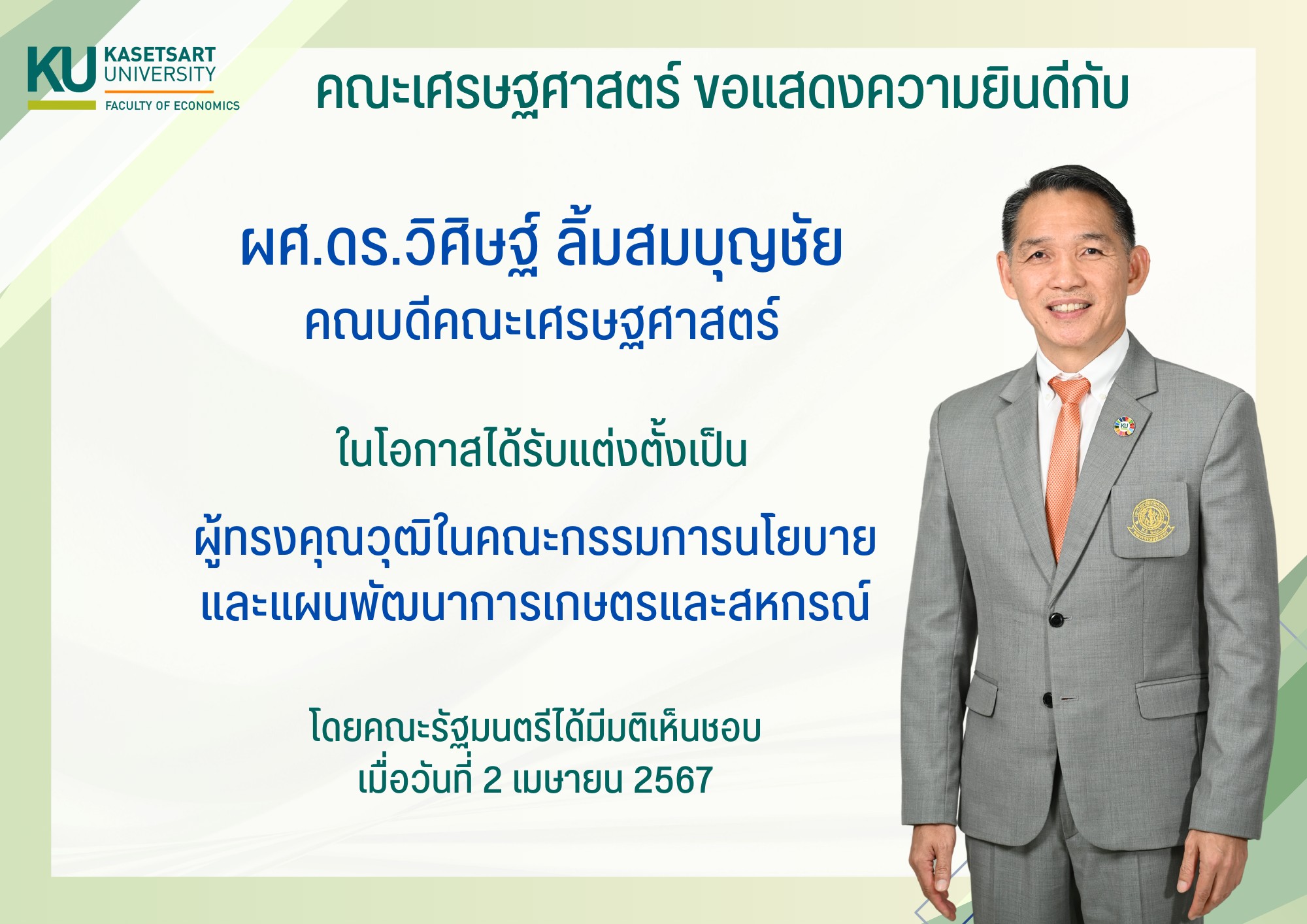 คณะเศรษฐศาสตร์ขอแสดงความยินดี ผศ.ดร.วิศิษฐ์ ลิ้มสมบุญชัย คณบดีคณะเศรษฐศาสตร์ ในโอกาสได้รับแต่งตั้งเป็น ผู้ทรงคุณวุฒิในคณะกรรมการนโยบายและแผนพัฒนาการเกษตรและสหกรณ์ โดยคณะรัฐมตรีมีมติเห็นชอบ เมื่อวันที่ 2 เมษายน 2567