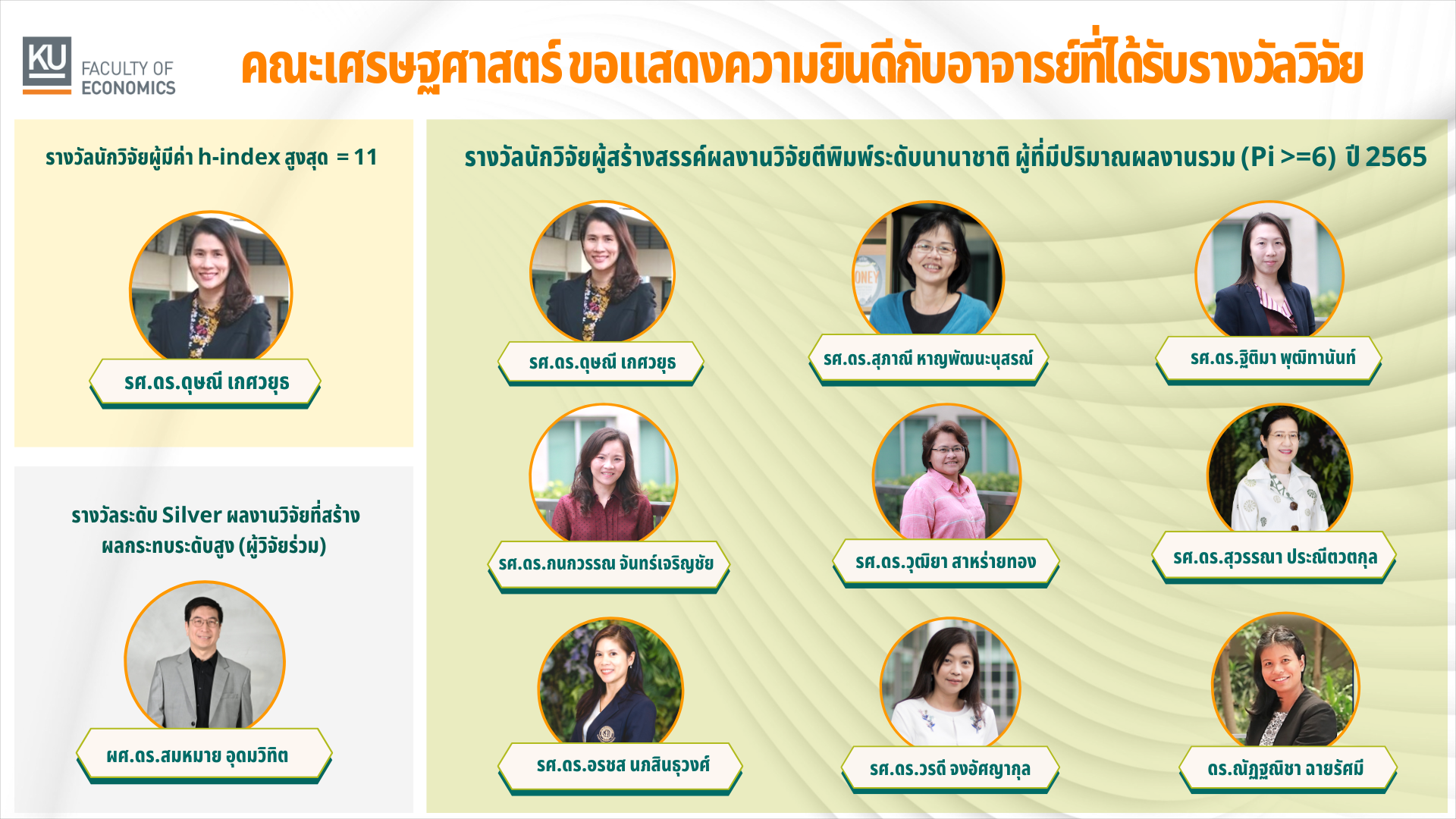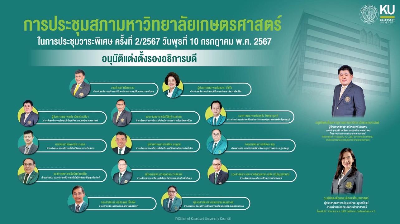 ขอแสดงความยินดีกับคณาจารย์ทุกท่านที่ได้รับ รางวัลผลงานวิจัยตีพิมพ์ระดับนานาชาติ ปี 2565 และ รางวัลผลงานวิจัยที่สร้างผลกระทบ ปี 2567 ของมหาวิทยาลัยเกษตรศาสตร์